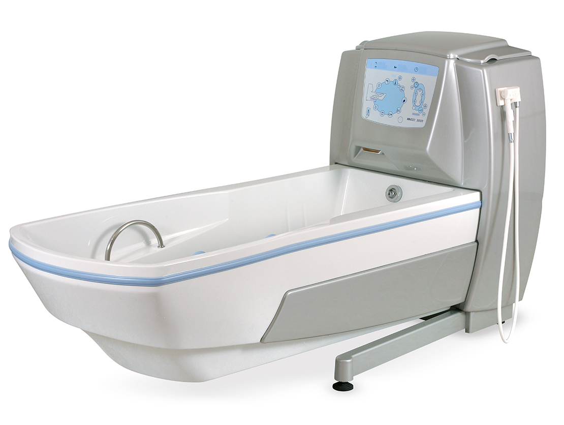 La Vasca Magic 3000 rappresenta la vasca più completa: la struttura a sbalzo in sospensione elettrica lascia liberi tre lati su quattro e la parte sottostante alla struttura stessa, permettendo allo staff sanitario di operare senza intralci di alcun tipo.